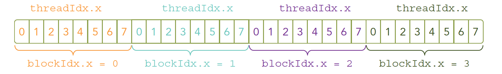 我们的核函数是同时复制到多个线程执行的,上文我们说过一个对应问题,多个计算执行在一个数据,肯定是浪费时间,所以为了让多线程按照我们的意愿对应到不同的数据,就要给线程一个唯一的标识,由于设备内存是线性的(基本市面上的内存硬件都是线性形式存储数据的)我们观察上图,可以用threadIdx.x 和blockIdx.x 来组合获得对应的线程的唯一标识(后面我们会看到,threadIdx和blockIdx能组合出很多不一样的效果)