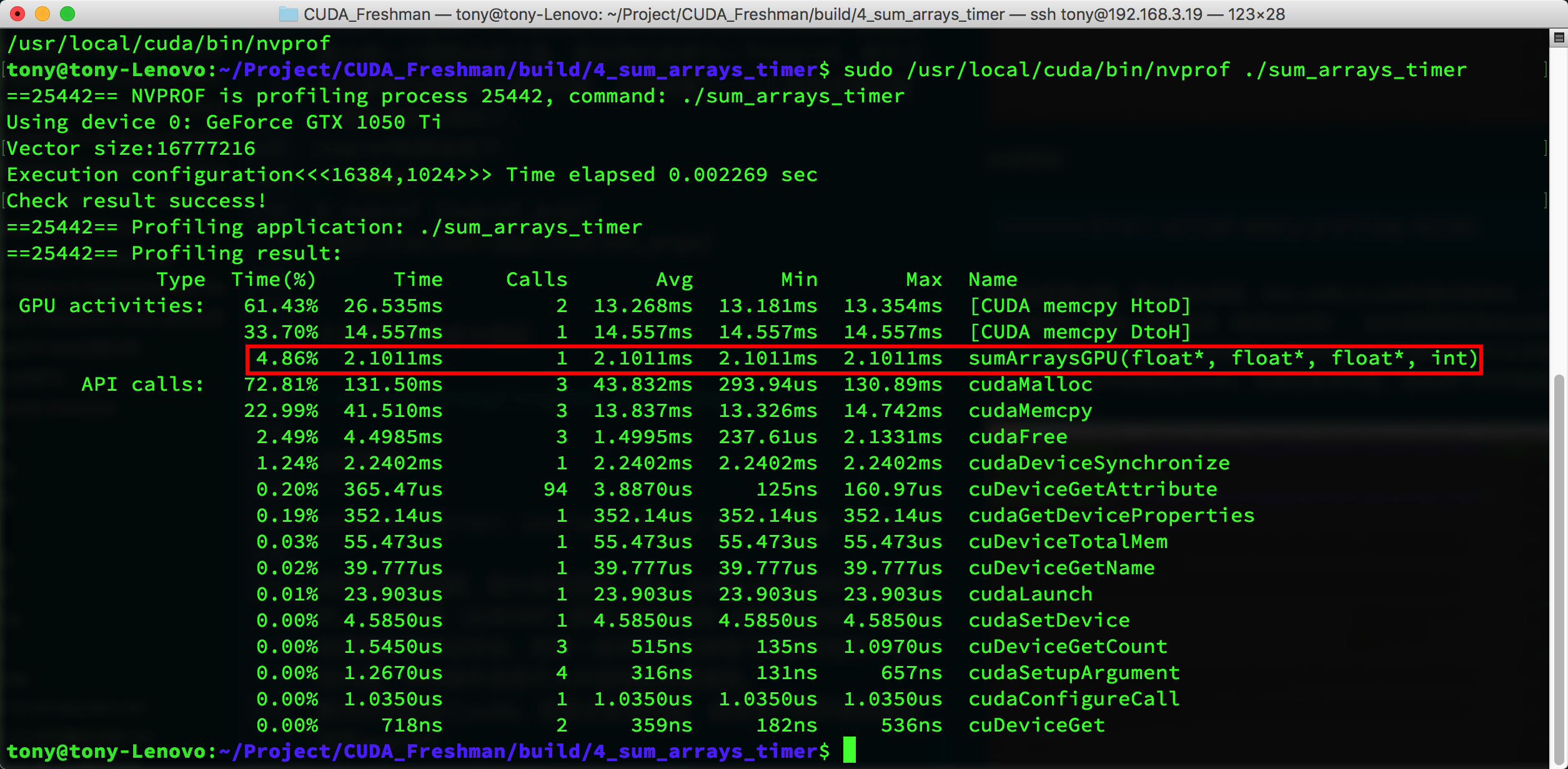 工具不仅给出了kernel执行的时间,比例,还有其他cuda函数的执行时间,可以看出核函数执行时间只有4%左右,其他内存分配,内存拷贝占了大部分事件,nvprof给出的核函数执行时间2.1011ms,上面cpuSecond计时结果是2.282ms