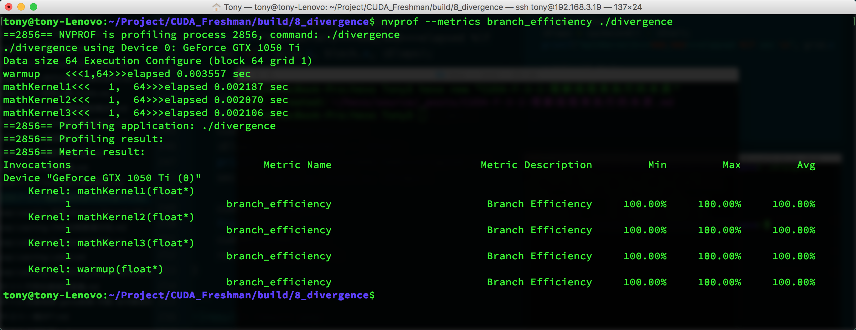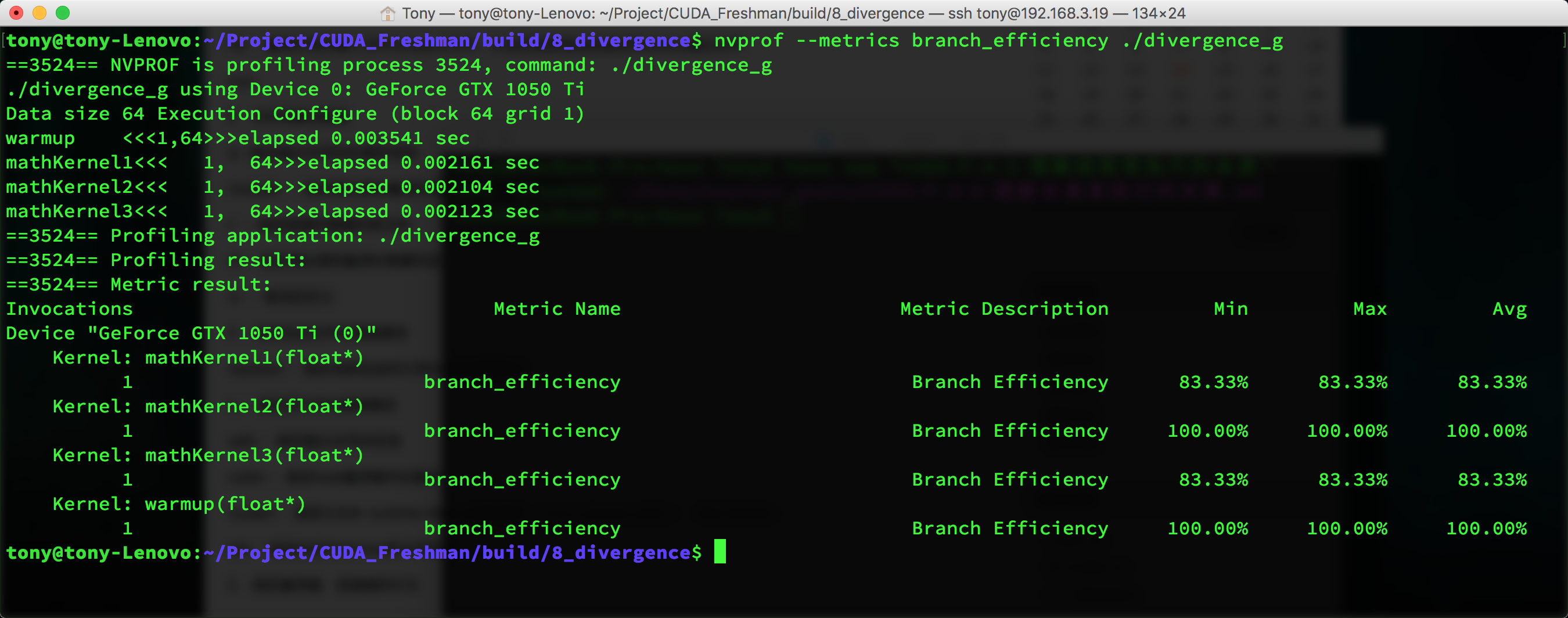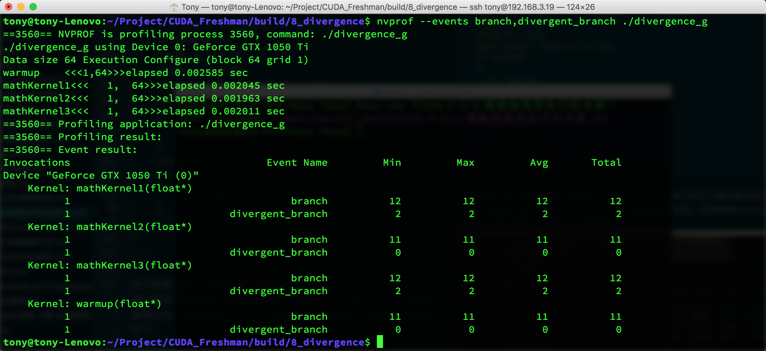 nvprof --events branch,divergent_branch ./divergence_g