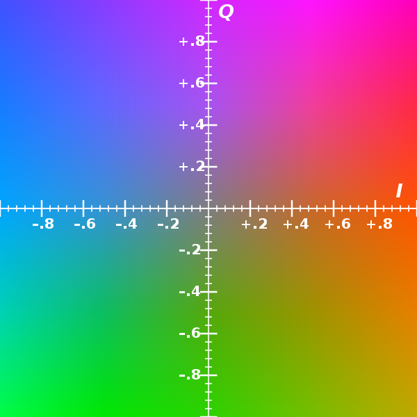 YIQ中Y代表亮度信号(Luminance),IQ作为附加信息,I表示相位(In-phase)色彩从橙色到青色,Q表示正交(Quadrature-phase)色彩从紫色到黄绿色,故YIQ也叫做色差信号(Chrominance signal)。