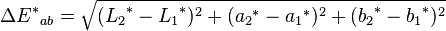 在Lab 模型中均匀改变对应于在感知颜色中的均匀改变。所以在Lab 中任何两个颜色的相对感知差别,可以通过把每个颜色处理为(有三个分量:L, a, b 的)三维空间中一个点来近似,并计算在它们之间的欧几里得距离。在Lab 空间中的这个欧几里得距离是ΔE(经常叫做“Delta E”,更精确的是ΔE*ab)。