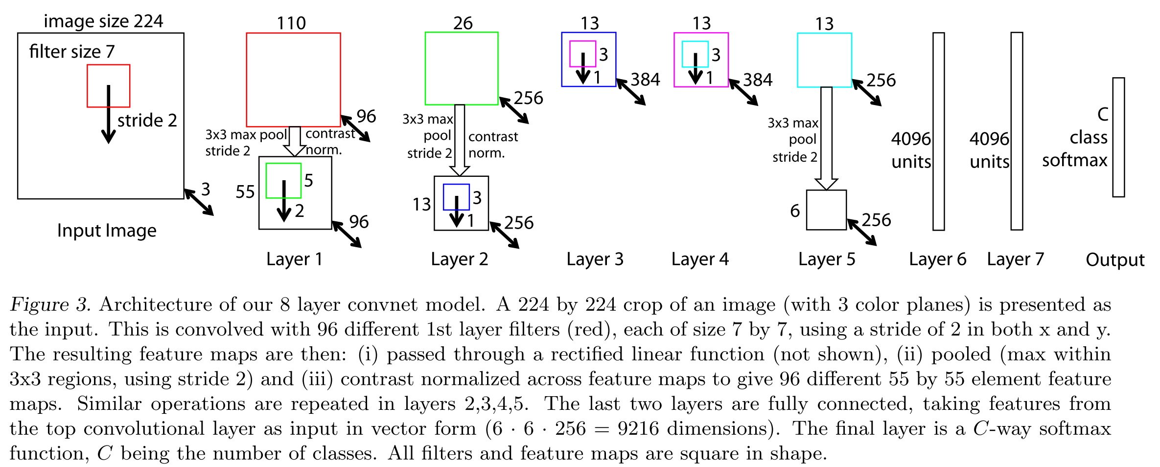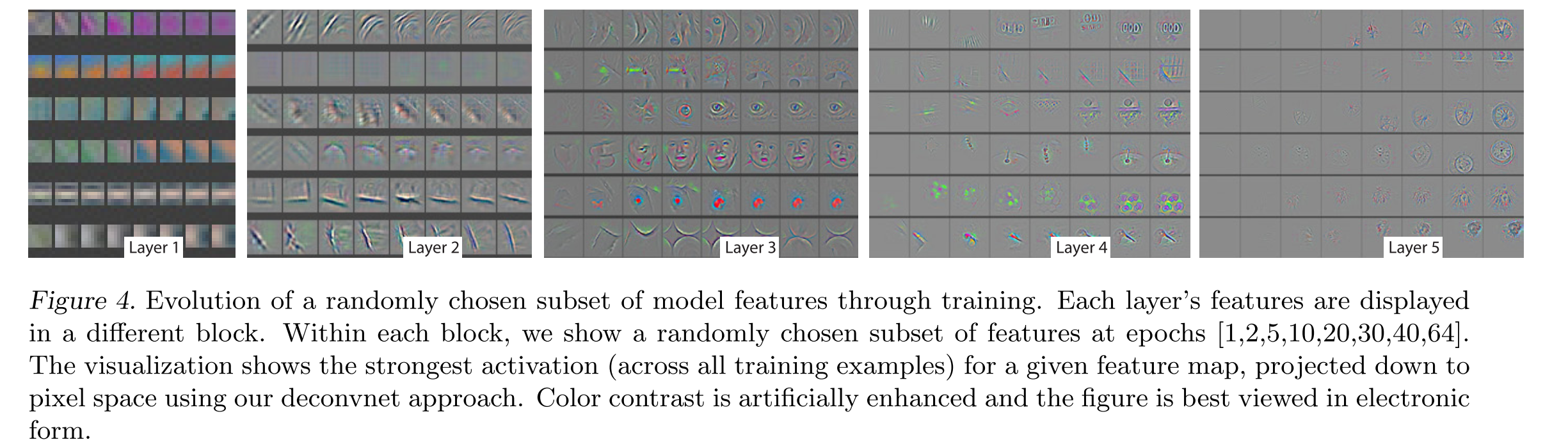 Feature Evolution during Training: Fig. 4 visualizes the progression during training of the strongest activation (across all training examples) within a given feature map projected back to pixel space.
