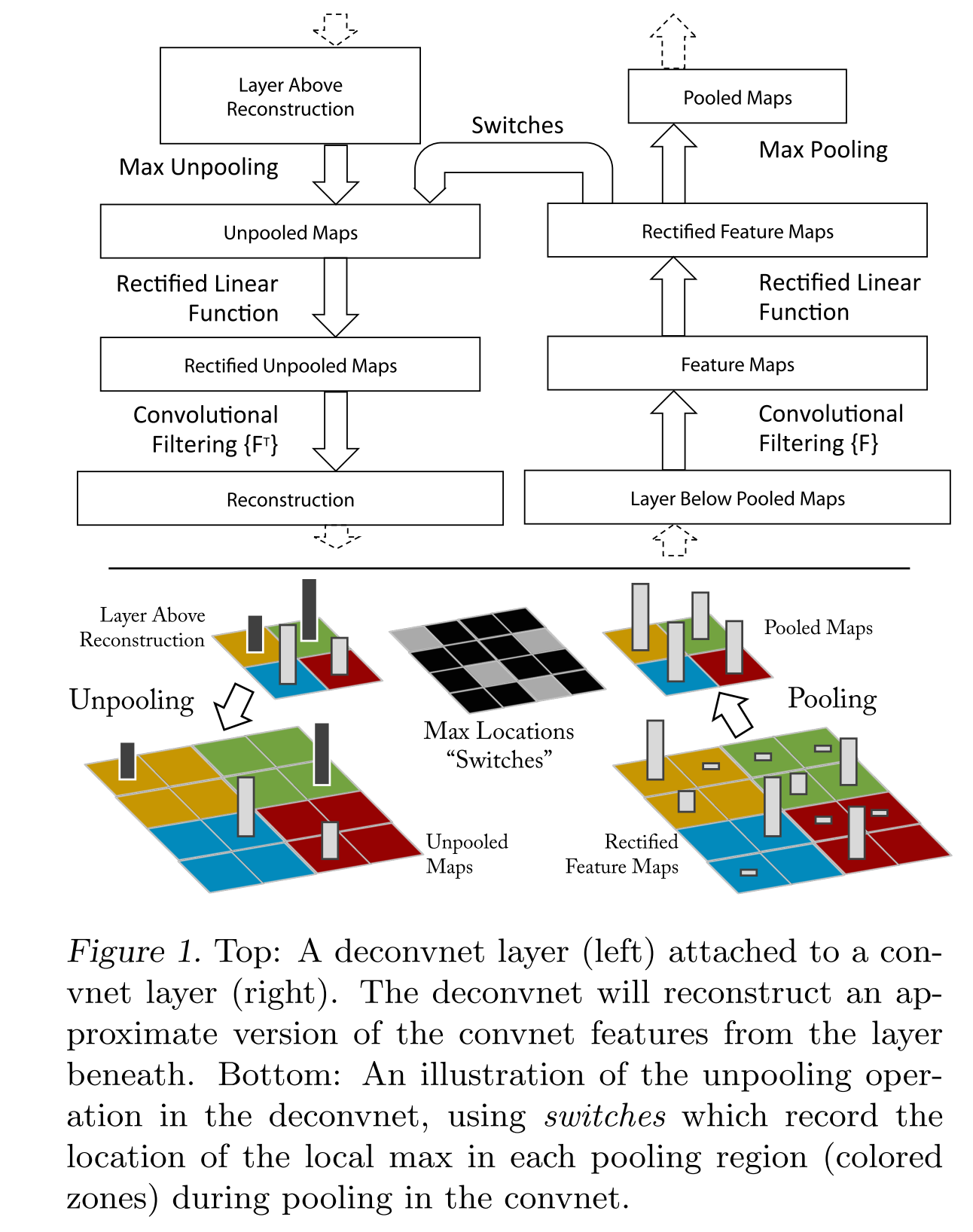 In the convnet, the max pooling operation is non-invertible, however we can obtain an approximate inverse by recording the locations of the maxima within each pooling region in a set of switch variables. In the>deconvnet, the unpooling operation uses these switches to place the reconstructions from the layer above into appropriate locations, preserving the structure of the stimulus. See Fig. 1(bottom) for an illustration of the procedure