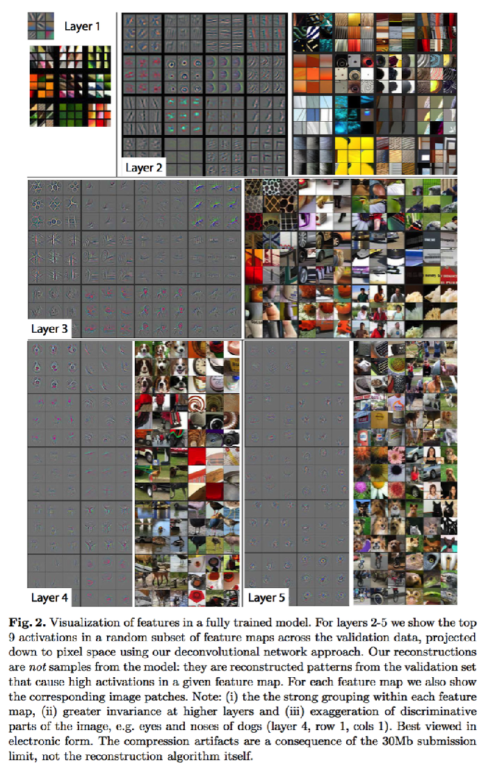 Feature Visualization: Fig. 2 shows feature visualizations from our model once training is complete. However, instead of showing the single strongest activation for a given feature map, we show the top 9 activations.