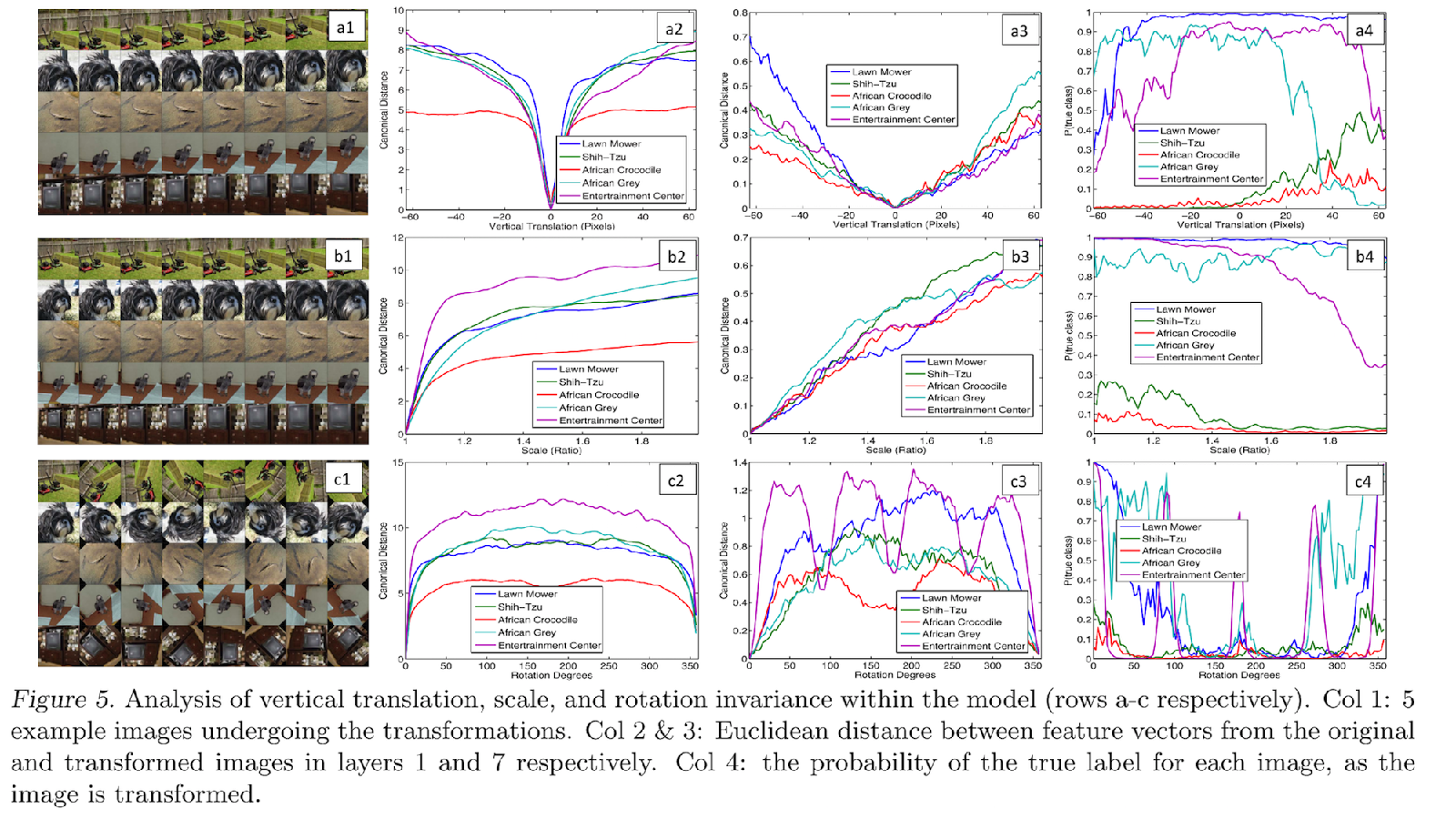 Feature Invariance: Fig. 5 shows 5 sample images being translated,rotated and scaled by varying degrees while looking at the changes in the feature vectors from the top and bottom layers of the model,relative to the untransformed feature.