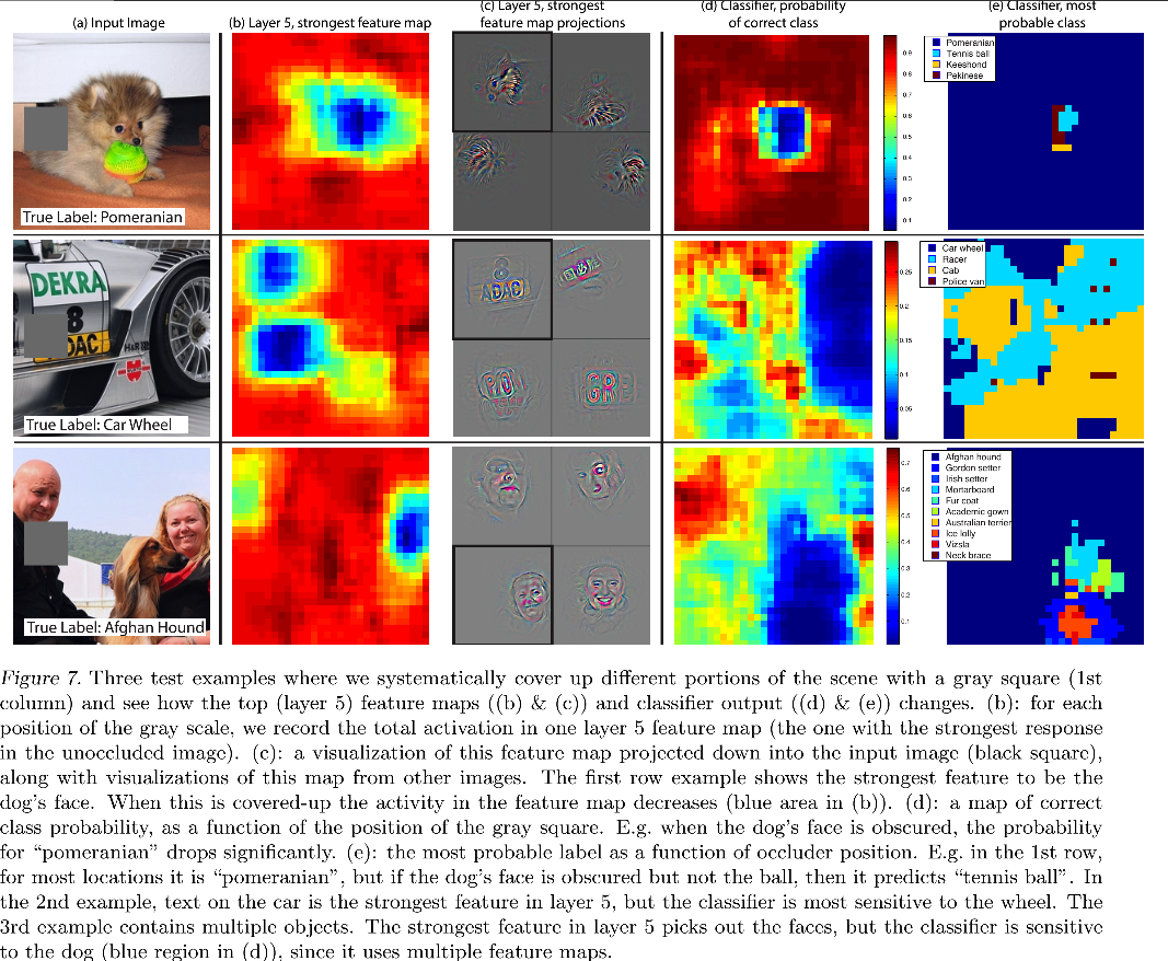 Fig. 7 attempts to answer this question by systematically occluding different portions of the input image with a grey square, and monitoring the output of the classifier.