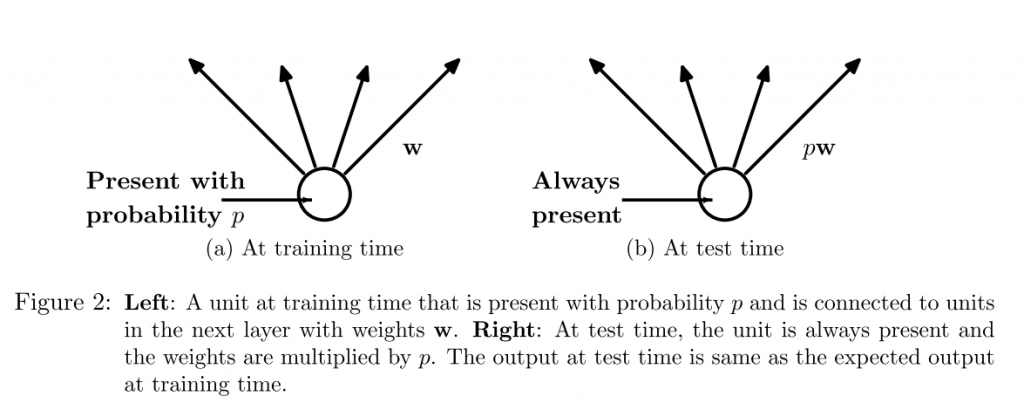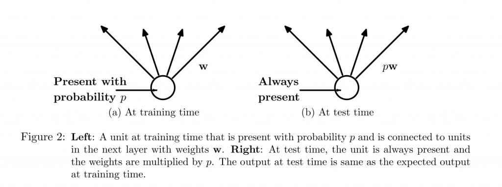 在测试阶段,明确的平均地平均指数级子网络的输出结果是不可能的,然而在实际中有一种非常简单的近似方法,这种思想被用于神经网络的测试阶段,而不需要把网络dropout后再测试。网络中的权重被缩小(与训练时的子网络比较),如果子网络选取方法是按照概率p来dropout,测试时所有权重乘以p来,