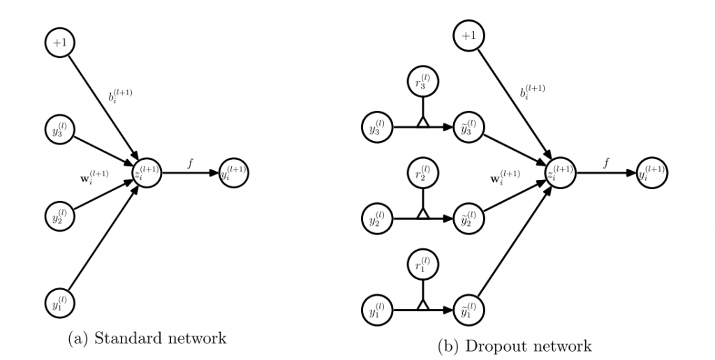 其基本描述是阻止过拟合,提供一种方法有效的联合指数级的不同的神经网络的近似形式。dropout的意思是丢掉网络中的一些单元(可见的或隐藏的神经元),通过暂时性的移除一些单元,包括其输入输出链接全部移除,移除的单元是随机挑选的,如图:
