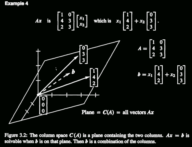 A是个矩阵,有m行,n列,每行有n个元素,每列有m个元素,刚开始学数字图像处理的时候,总是分不清行和列,高和宽是啥。哈哈哈,还记得我们的矩阵乘法么?我们首先研究的是$Ax=b$里面的”Column Picture”就是列空间的一种体现,也就是把A中的每一列当做空间内的一个向量,通过(ii)的方式组合出的新向量 $\textbf{b}$一定也是在A的所有列所在的空间内,这就是列空间。