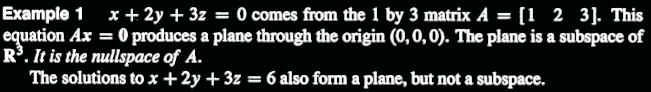 其实这个nullspace还是挺别致的,起码他包含0,而之前Ax=b就不一定包含0。所以可以看出,nullspace是个subspace,原因是如果x,y向量Nullspace里面的两个向量,那么$A(x+y)=0$,并且$A(cx)=0$成立,所以nullspace是个子空间 $Ax=b$并不一定是。