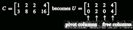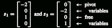 这个例子是找C矩阵的nullspace,上面忘了说了,如果你想研究nullspace首先要进行一些列的elimination操作,也就是把原始矩阵转化成U(上三角矩阵),矩阵U中有主元的叫做主列,也就是说这部分系数是完整的,比如有两个主列,那么这两个主列对应的x中的元素就是不自由要委屈自己的,因为他有足够多的限制,而那些没有主元的列就是free列了,这些列在x中对应的元素就可以放飞自己了,但是一般情况下我们会分别让他们是0和1,这样free部分可以以标准基的形式出现,张成整个free空间,然后让主列的x元素去委屈自己,这个地方这么理解可能有点困难,仔细看下面这段话: