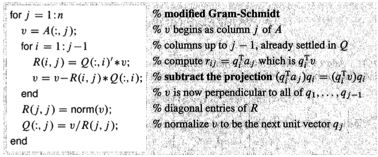 在实际分解中并不是使用QR分解,而是有更快的计算方法,这个我们后面肯定还要讲,因为要研究计算方法和矩阵分析,这就留个引子吧,Gram算法的具体步骤就贴个书上的吧: