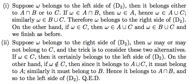 接着钟老师用了一个食物的例子来证明了一下 $D_1$ 这里就不详细说了,这个比较简单,我们下面用数学的方法来证明下 $D_2$ 证明思想就是(I)证明属于左边的元素都属于右边,(II)再证明右边的元素都属于左边 $M \subset N$ and $M \supset N$