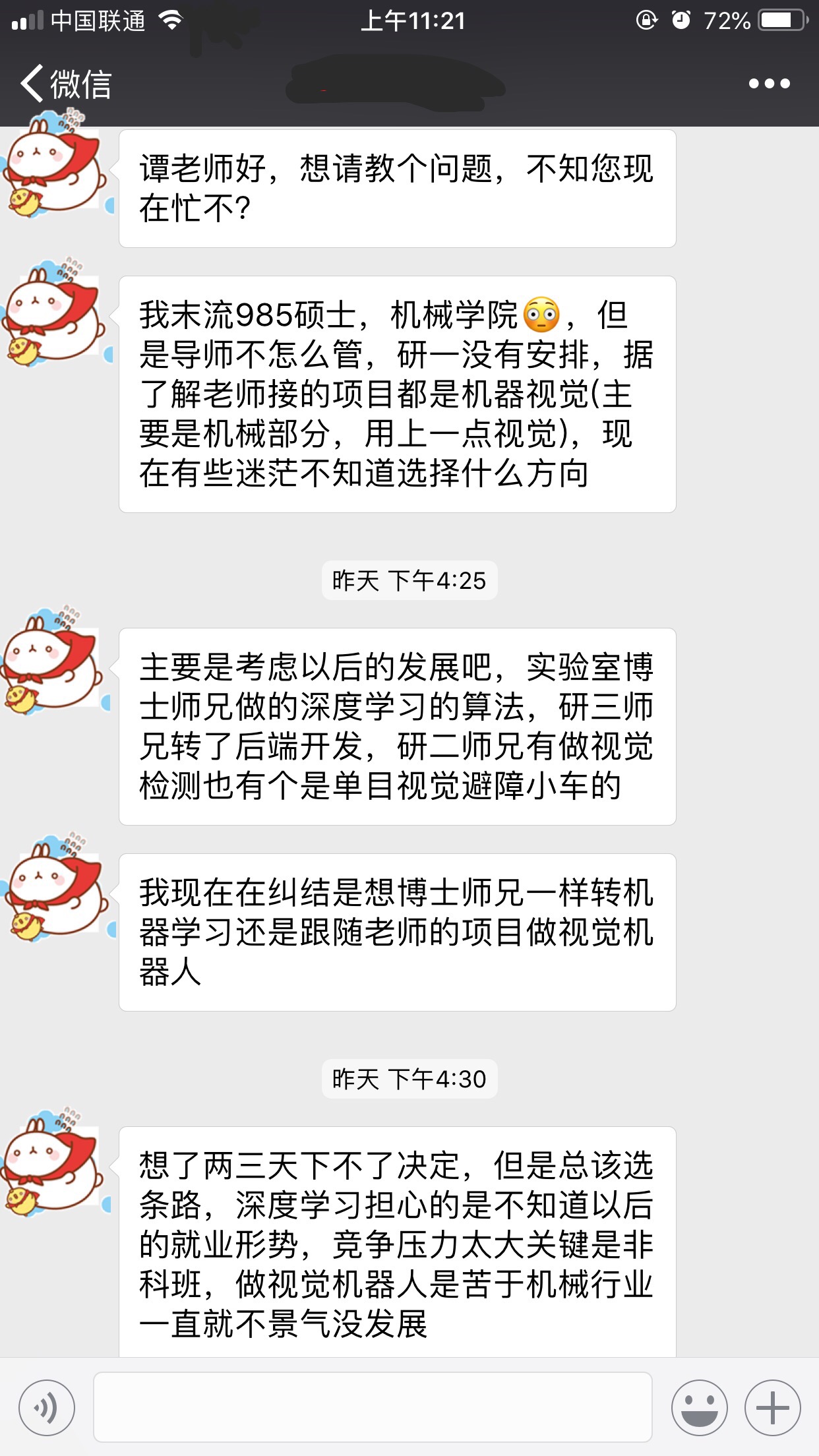 很高兴收到的微信咨询,本来想在微信上回复你,但是我觉得还是好好思考一下你的问题然后把这些问题大概总结一下,回复给你可能更准确也更有帮助,另外我觉得有你这些问题的人应该不少,所以,如果你同意我会在博客上公开这封回信和我们的部分聊天记录,当然我会隐藏掉所有您的个人信息。