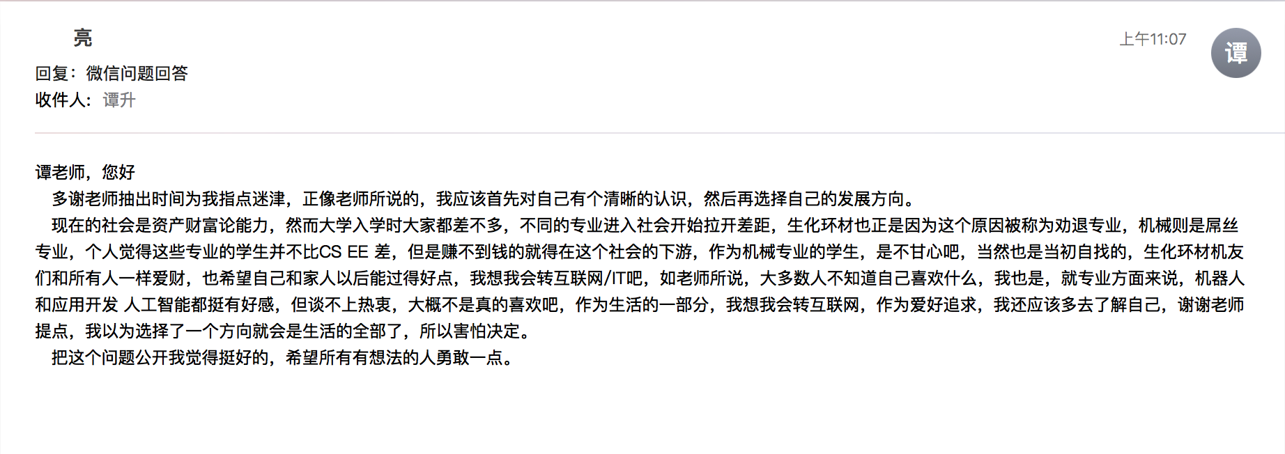 现在的社会是资产财富论能力,然而大学入学时大家都差不多,不同的专业进入社会开始拉开差距,生化环材也正是因为这个原因被称为劝退专业,机械则是屌丝专业,个人觉得这些专业的学生并不比CS EE 差,但是赚不到钱的就得在这个社会的下游,作为机械专业的学生,是不甘心吧,当然也是当初自找的,生化环材机友们和所有人一样爱财,也希望自己和家人以后能过得好点,我想我会转互联网/IT吧,如老师所说,大多数人不知道自己喜欢什么,我也是,就专业方面来说,机器人和应用开发 人工智能都挺有好感,但谈不上热衷,大概不是真的喜欢吧,作为生活的一部分,我想我会转互联网,作为爱好追求,我还应该多去了解自己,谢谢老师提点,我以为选择了一个方向就会是生活的全部了,所以害怕决定。